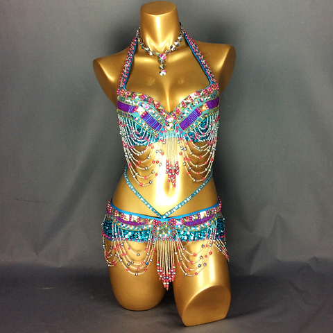 Disfraces de espectáculo de escenario para mujer, traje Sexy de Samba, Carnaval, danza del vientre, conjunto de cinturón con sujetador de alambre, atuendo de fiesta, bailarina Rave, novedad